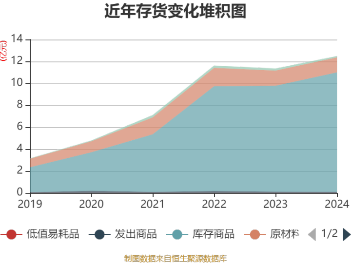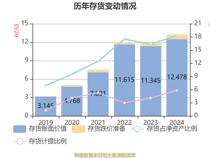 从存货变动来看,截至2024年末,公司存货账面价值为12.48亿元,占净资产的18.32%,较上年末增加1.13亿元。其中,存货跌价准备为7670.39万元,计提比例为5.79%。