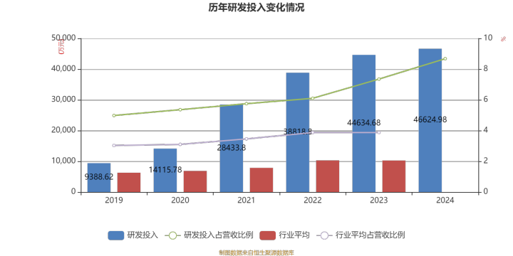 2024年全年,公司研发投入金额为4.66亿元,同比增长4.46%;研发投入占营业收入比例为8.68%,相比上年同期上升1.33个百分点。