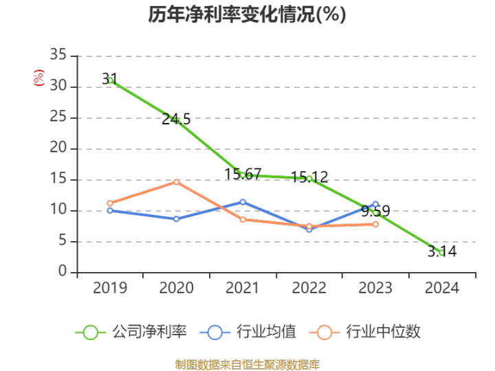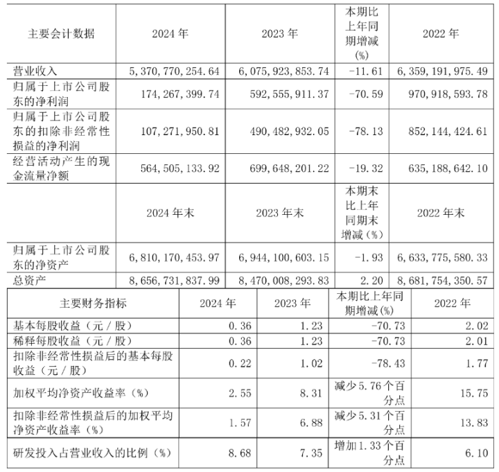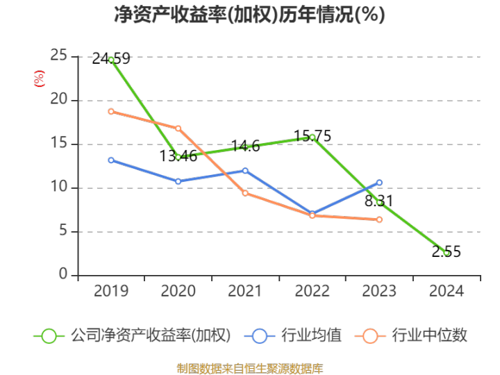 数据显示,2024年公司加权平均净资产收益率为2.55%,较上年同期下降5.76个百分点。公司2024年投入资本回报率为2.21%,较上年同期下降5.59个百分点。